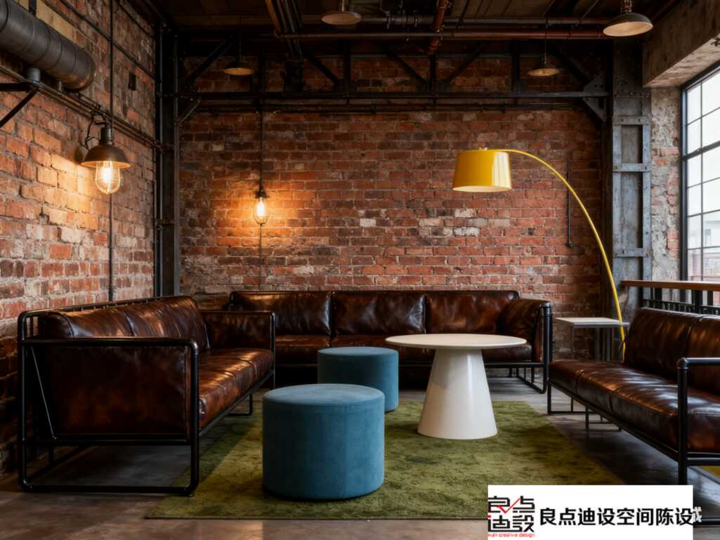 🔥 1. 软装C位搭配:金属+皮革+木纹YYDS! * 金属元素: 别只盯着水管灯!* 皮质沙发/单椅: 休息区、老板椅安排上!棕色、墨绿皮质是工业风的灵魂伴侣,一摆进去,复古摩登那味儿就有了!磨砂皮更显高级。 * 温润木纹中和: 工业风太硬?原木色桌面、开放木格书架了解一下!浅木色能瞬间注入自然暖意,平衡水泥灰的清冷感。 选有做旧纹理的,别整太光滑!