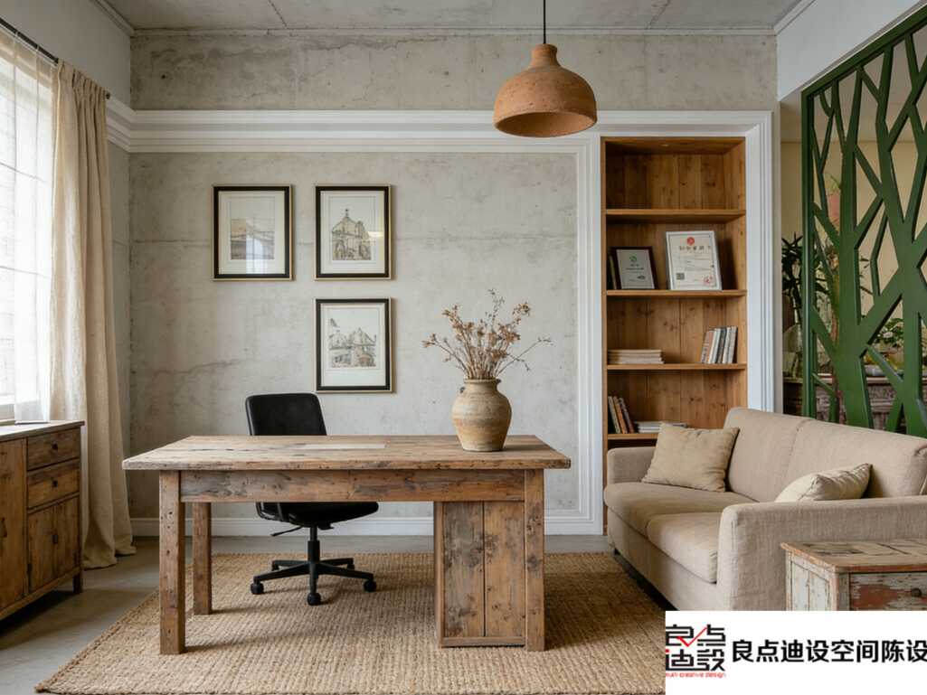 办公区的C位,是张老榆木大桌。天然的裂纹和时间痕迹,自带故事感。搭配线条利落的黑色单椅,一柔一刚,审美在线。桌上随意插两枝枯枝,侘寂风那种“不***之美”的灵魂,瞬间到位。