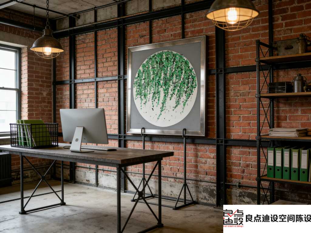 ***让我拍大腿的,是会议室那幅绿调抽象装饰画!红砖、黑钢、水泥…全是硬朗的中性色,难免有点闷。这一抹充满生命力的绿意加进来,视觉瞬间有了焦点,层次感也丰富了,***中和了工业风的粗犷,简直神来之笔!