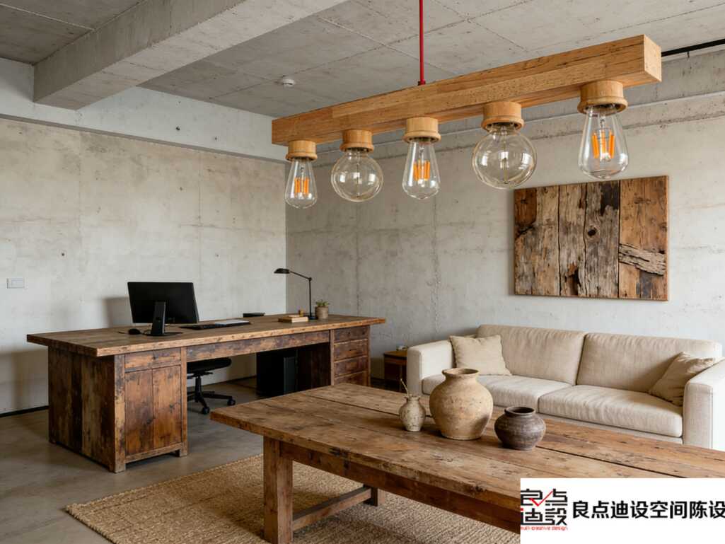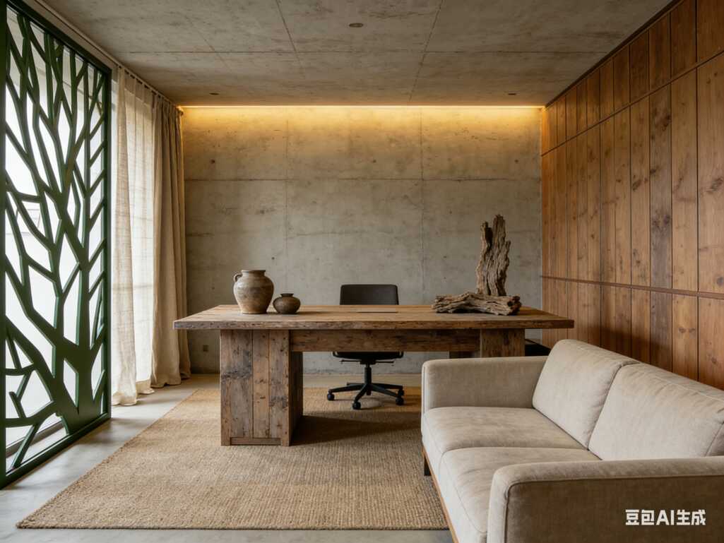 水泥墙+原木桌,谁家办公室把侘寂风和工业风玩得这么绝啊!