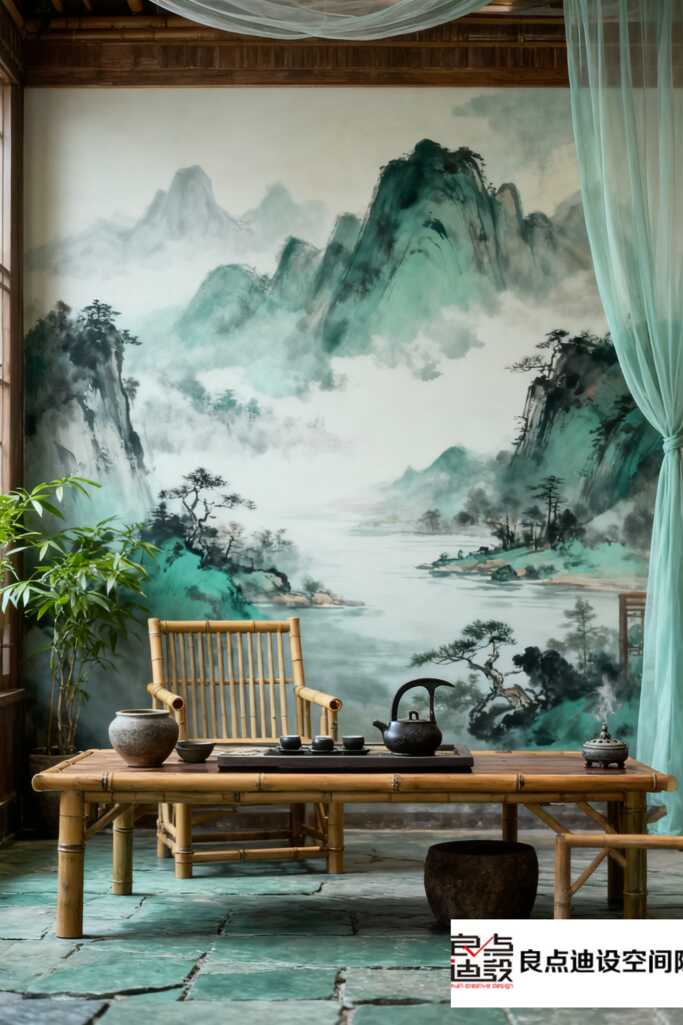 一进门,视线瞬间被整面山水壁画背景墙抓住。淡墨色的山峦层层叠叠,云雾像会流动一样,仿佛直接把江南烟雨搬进了室内。这种写意手法真的绝,不抢戏,却稳稳地定下了整个空间清幽宁静的基调。