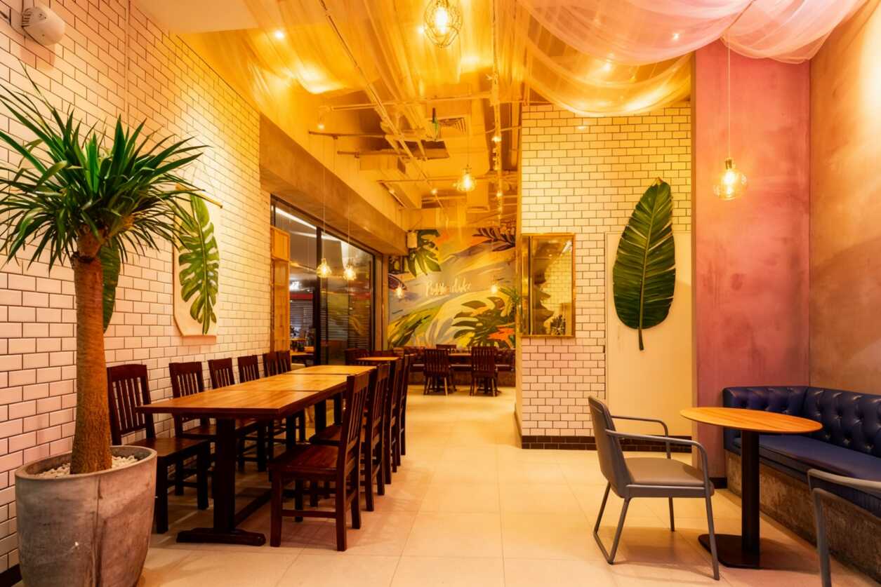 宝子们!看到这张效果图我直接种草了!这家餐厅居然把热带度假风玩得这么溜——白砖墙打底,热带植物壁画点缀,再配上轻盈的纱幔,这氛围感绝绝子!