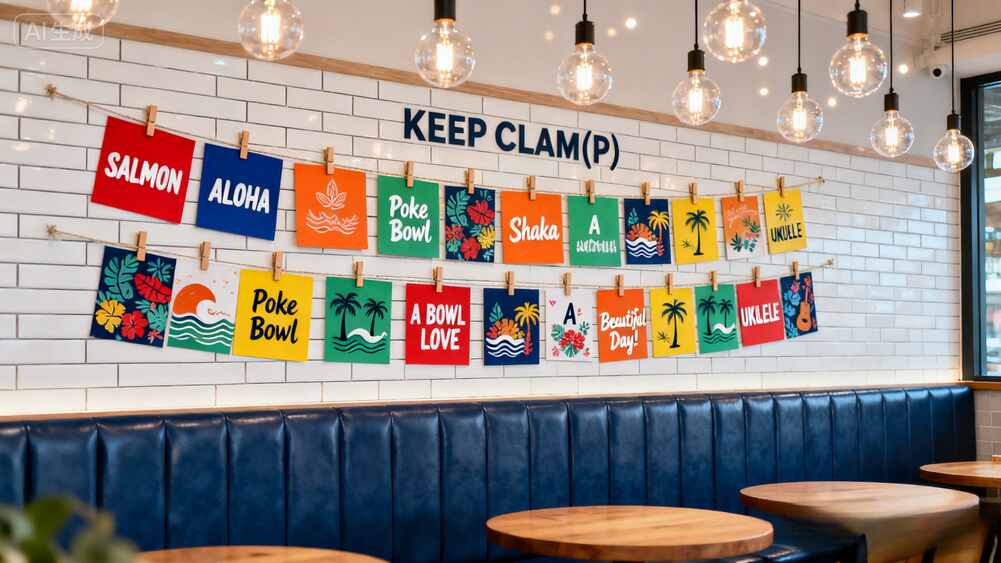 "SALMON""ALOHA""Poke Bowl"这些字样搭配花朵、海浪图案,设计感直接拉满。***戳我的是那个"KEEP