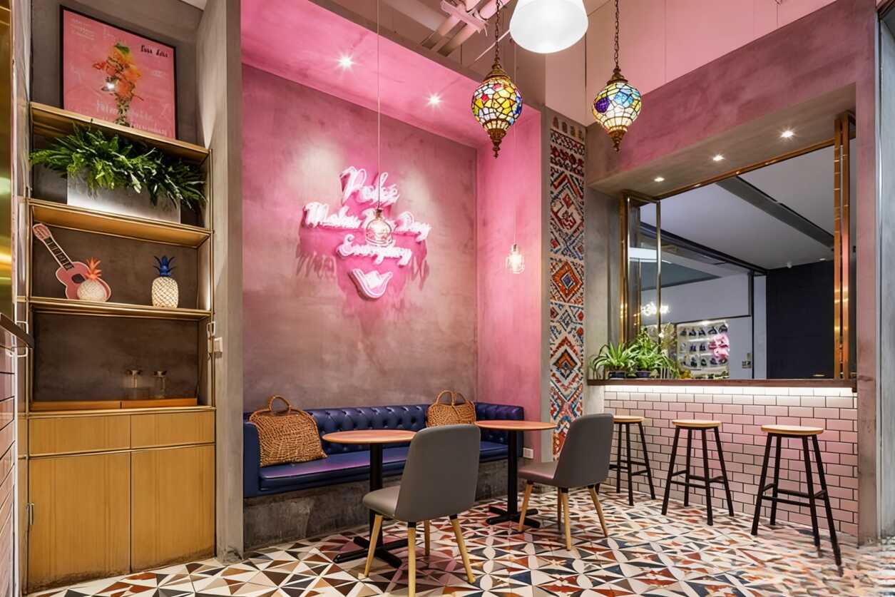 先看主角:白墙上挂着一排彩色卡片,用原木夹子固定,简单却贼有巧思。卡片上印着“SALMON”“ALOHA”这种俏皮英文,搭配棕榈树、小花朵图案,瞬间带出夏威夷般的轻松调调。往下瞄,白色瓷砖墙+深蓝色皮质卡座,再配个木质圆桌,层次感立马就出来了。***绝的是头顶那两盏透明球形吊灯,光线一打,温馨指数飙升,拍照根本不用滤镜!