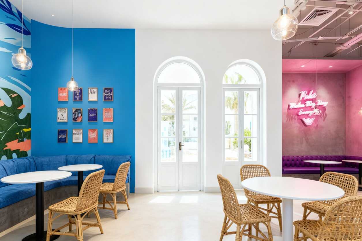 一进门就被这面蓝色主题墙拿捏住了!饱和度超正的宝蓝色墙上,用白色线条勾勒出“Poke-d”品牌字样,一条大鱼从字母间游过,配上几片棕榈叶,瞬间把夏威夷海边的氛围搬进室内。别看只是一面墙,它可是整个空间的视觉焦点,拍照当背景板绝绝子!