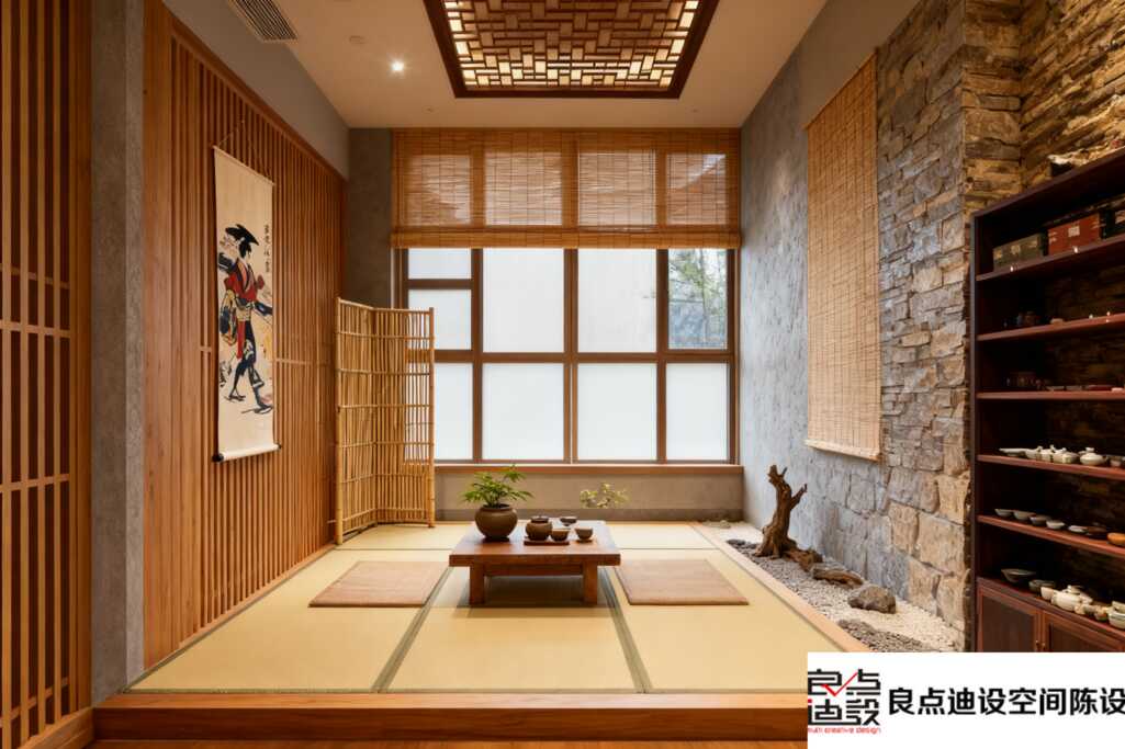 传统元素比如木材、水墨、枯山水,保留了东方的含蓄典雅;但现代感藏在细节里:蒲团加了记忆棉垫、灯光用LED调出暖色调、储物架做成极简线条。这种设计不仅好看,还超级实用——朋友小聚、商务洽谈甚至一个人发呆,都能找到舒服的角落。