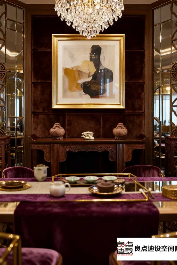 一进门,整个空间的基调就被定下了。深色实木桌椅是骨架,稳得住场子。但妙就妙在,设计师给每把椅子都“穿”上了酒红色的丝绒坐垫!绝不绝?木质的中式感还在,但丝绒的贵气和慵懒感一下子漫出来了,坐上去感觉不是来喝茶,是来谈一场风花雪月的。