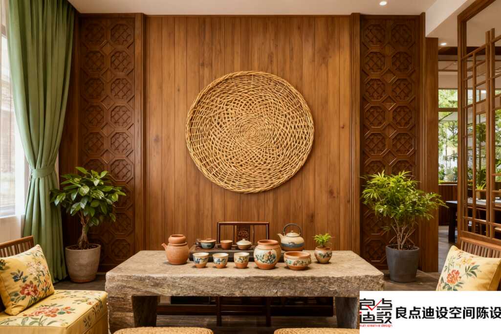 首先,色彩与材质是它的***张***。整体以棕褐、暖金、米白为主色调,就像一杯温润的陈年普洱。你能看到大量原木、棉麻、藤编这些带自然肌理的材质。桌椅不是光亮崭新的,而是带着温润手感的木质,坐垫是素色亚麻,这种材质语言一下子就让人放松下来。没有刺眼的金属和冷冰冰的大理石,整个空间是“会呼吸的”。