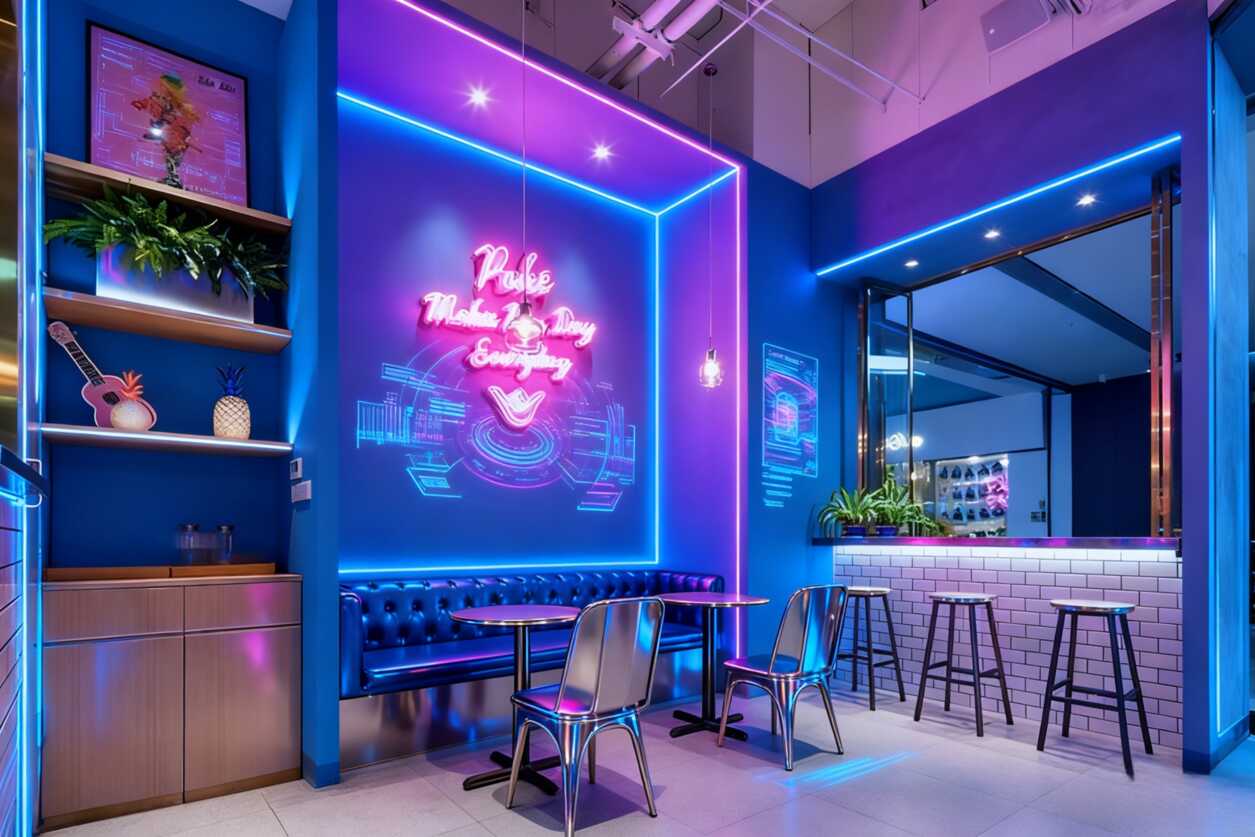老板真的太会了!复古小电视直接勾起回忆杀,旁边那面粉紫色灯光照射的砖墙更是绝绝子。圆形灯饰散发着温柔光晕,搭配角落里的绿植,整个空间既梦幻又生机勃勃。这种冷暖色调的碰撞,简直是把氛围感玩明白了!