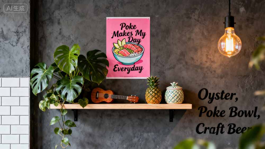 暖黄灯泡***是点睛之笔!光线打在水泥墙上泛出淡淡光晕,连工业风的冷峻都变得温柔起来。"Oyster, Poke Bowl, Craft Beer"的标语用***直接的方式宣告店家特色,这种不拐弯抹角的个性反而很拉好感。