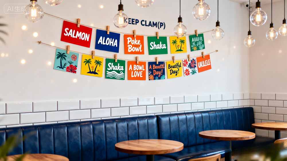 姐妹们!这家以"ALOHA"为主题的波奇碗餐厅也太会了吧!一进门就被满墙的彩色卡片惊艳到 - "SALMON""Poke Bowl"字样与棕榈树图案随风轻摇,瞬间穿越到夏威夷海边。深蓝色皮质卡座搭配原木圆桌,度假感直接拉满!