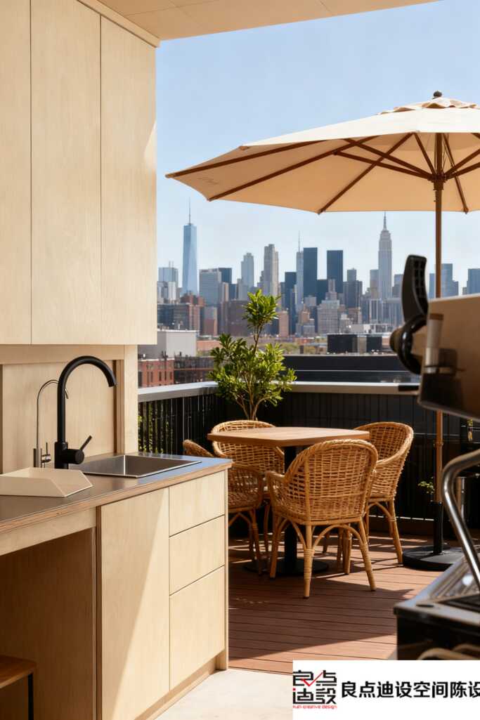 整体米白与浅木的配色,就像加了柔光滤镜。但软装如果想避免“样板间”既视感,一定要加入深色锚点——比如图中人物的黑衣帽、深色锅具,稳住气场。墙上“良点迪设”的标识也提示我们:专业设计团队往往擅长用品牌元素做点睛软装,既不突兀又强化记忆点。