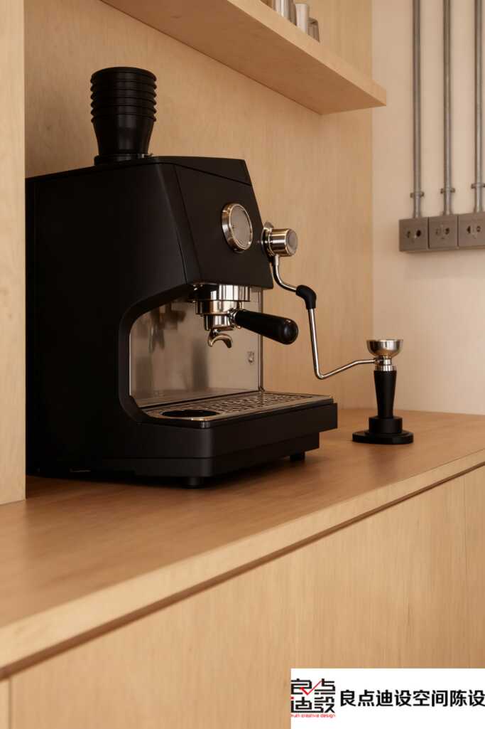 背景里那排木质置物架更是个妙笔。错落有致的设计,不仅多了收纳空间,还让整个店面层次感满满。架上随意放些陶罐、艺术书或复古咖啡器具,立马增添故事感。整体色调以原木、黑白和绿意为主,没半点多余装饰,可就是这种“留白”手法,反而衬得每一处都精致耐看。
