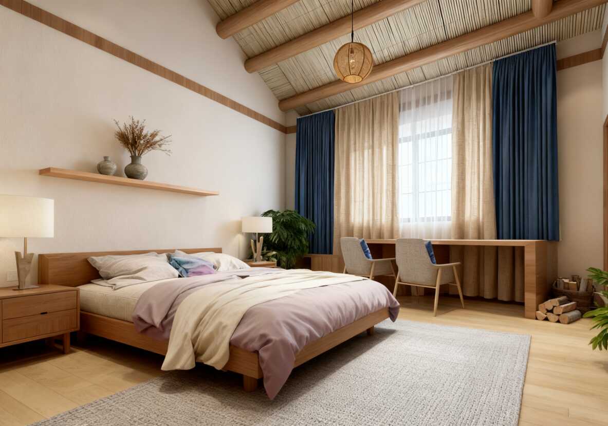 远处卧室的棉麻床品也很绝,浅灰调跟原木家具融合得恰到好处,躺上去就像陷进云朵里,完全是 “躺平星人” 的快乐老家!隔断柜里的小绿植,把生机感揉进木质空间,随手一拍都是 “隐世生活家” 既视感。