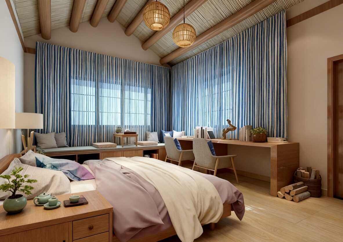 门窗设计:推拉门和大窗户太懂度假人啦!推开门就是户外的小露台(脑补一下摆个躺椅喝茶的画面),竹帘一拉,隐私感和氛围感同时get,这种把室外景色“框”进房间的设计,谁看了不说一句绝👍